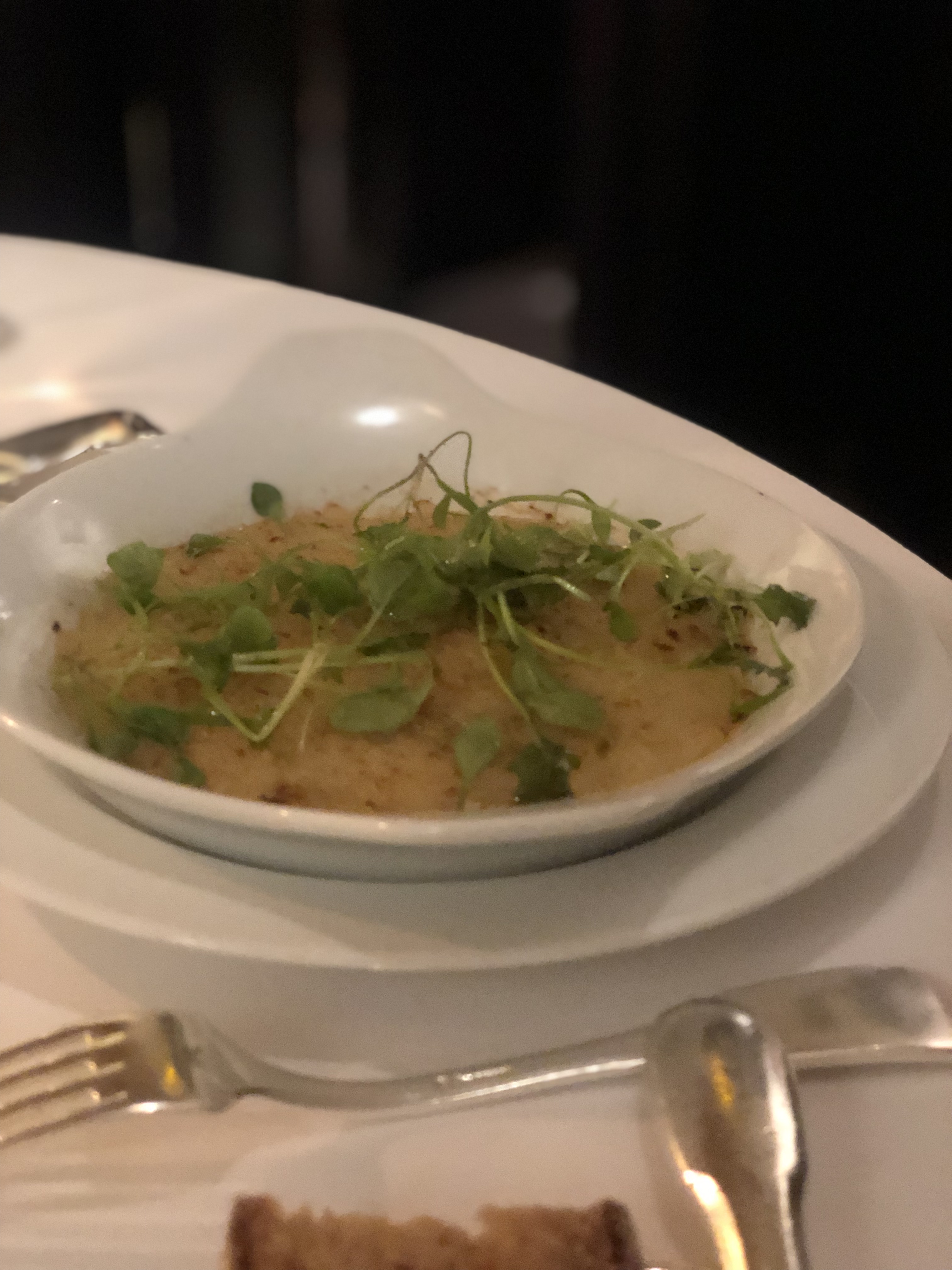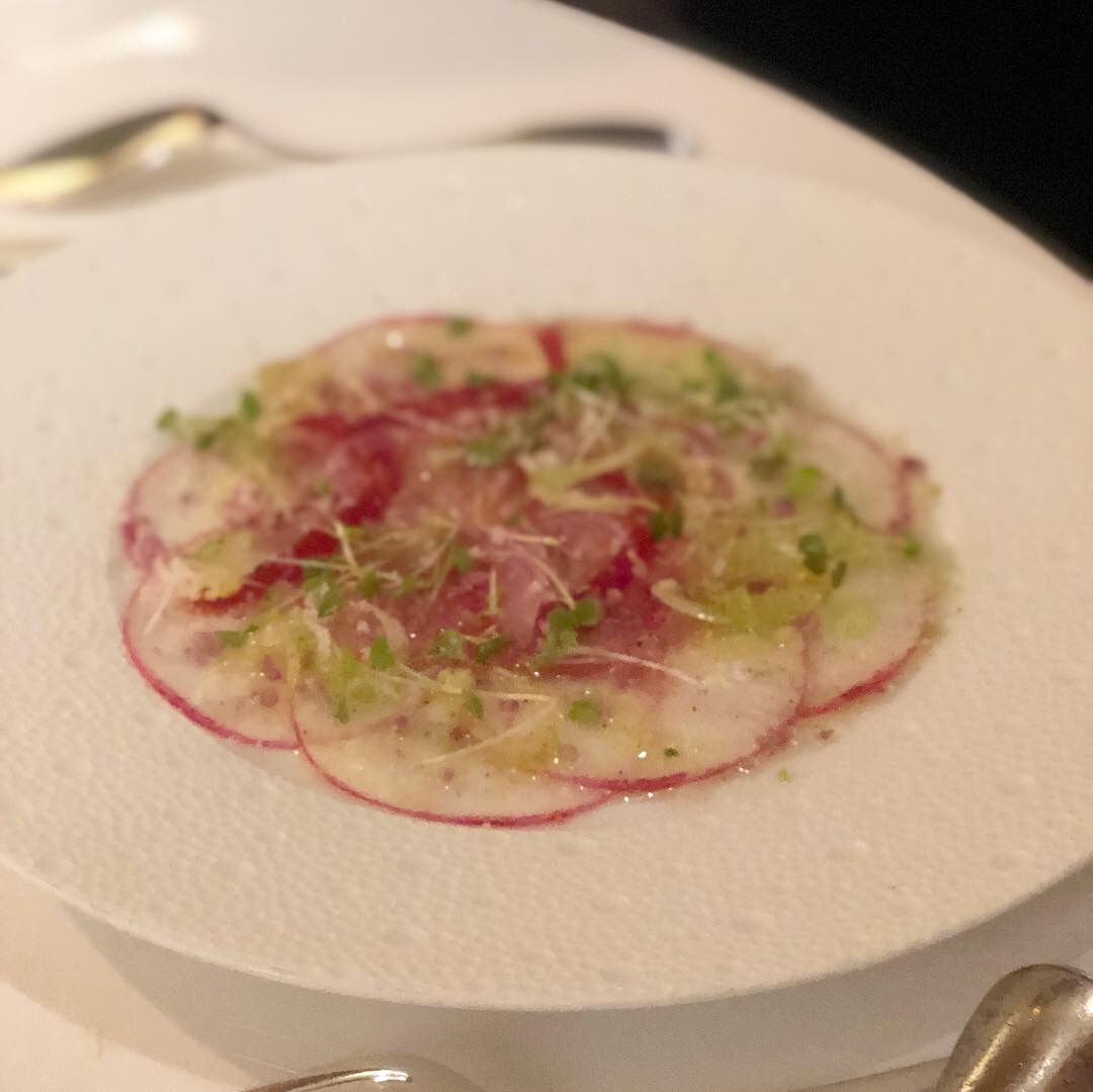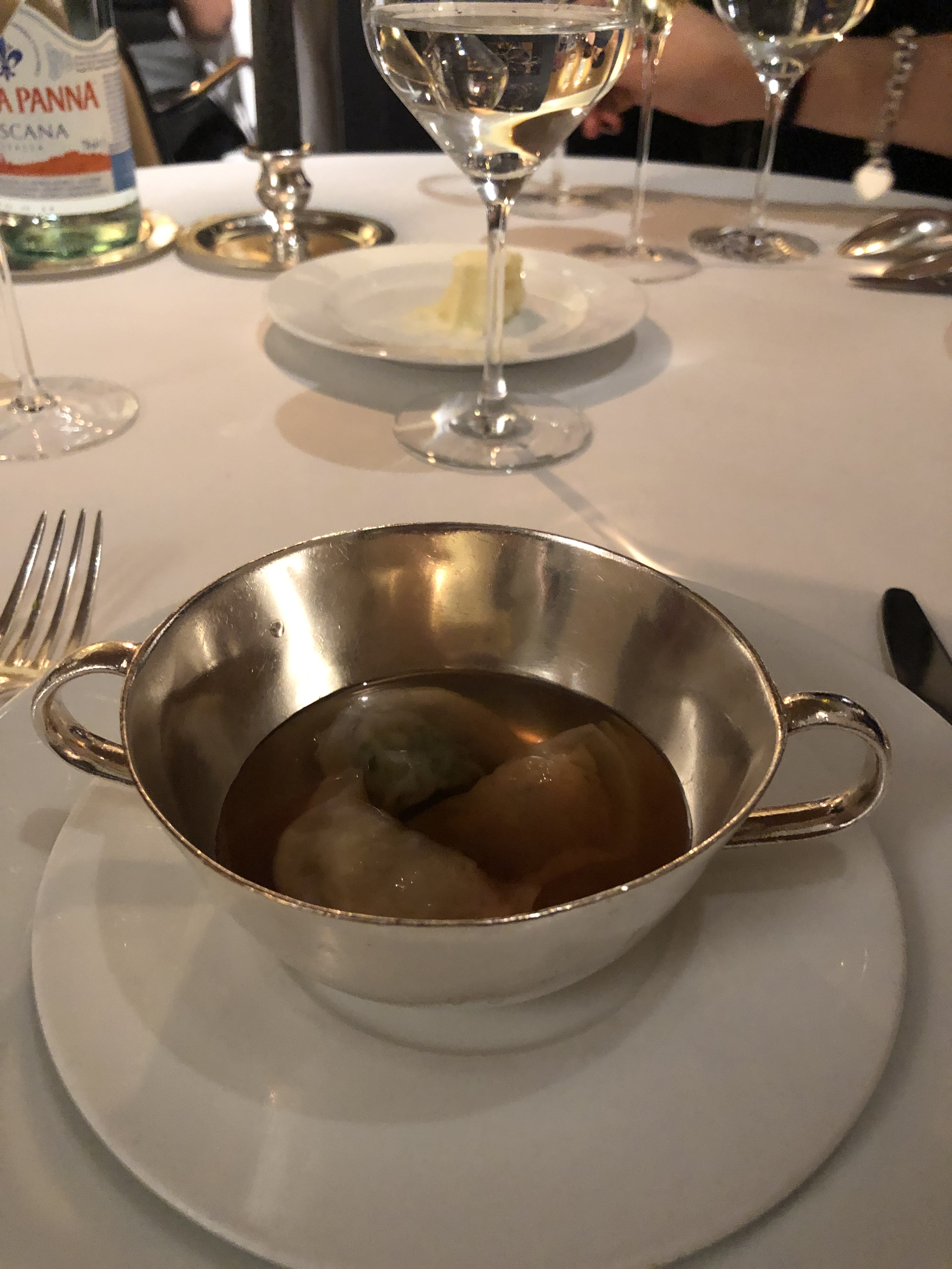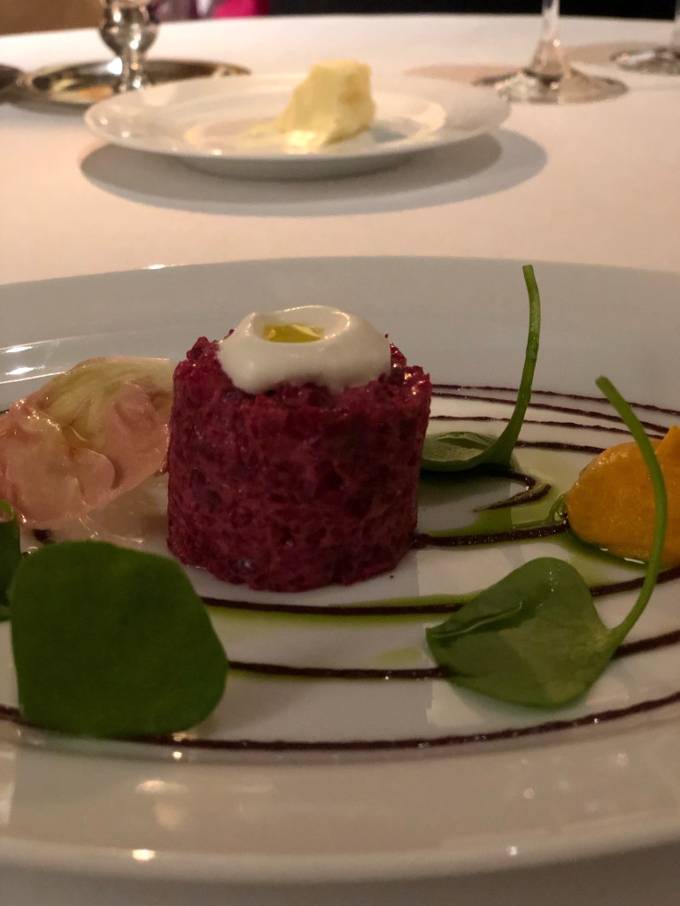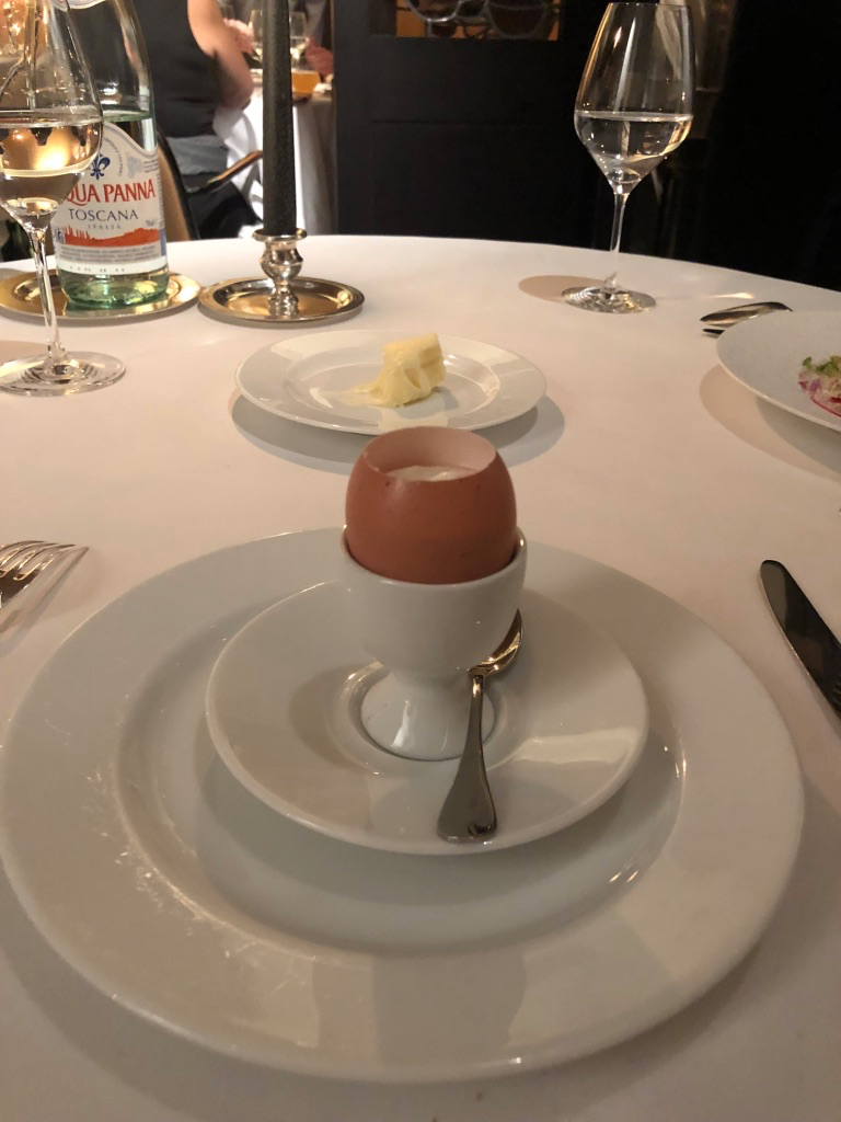 Now the food. We were greeted with hot-cold soft boiled egg amuse bouche, served in the shell. It is obvious this is an esteemed dish. This is for a reason. Every note sings. The cream and the eggs are a perfect pair. It’s whimsical presentation piques enough of your interest to excite you for the meal to come. Following this was one of my favorite courses. Three different root vegetable raviolis, one filled with celery, one with sweet potato, and one with radish, served in a consommé that I could only assume had been cooked over multiple hours. Each ravioli released a filling so silky, perfectly complimenting the consommé that accompanied it. It evoked the same emotion I feel when thinking about my grandmother’s daal, and this seemed to be made with just as much care. A visually intriguing dish, the onion gratin with pea shoots was complex. Getting the onions to be that tender and sweet required a level of precision that one would expect from a team like the one at Arpège. Serving a radish carpaccio with microgreens after an onion gratin felt redundant. Although the radish was bright and acidic, the concept felt the same as the onion gratin. My dining companion was served a beet tartare that was far more divine and what I wish I had been served instead. It was perfectly luscious, and kept your taste buds energized as a result of the horseradish cream. This should be served on every tasting menu at Arpège.