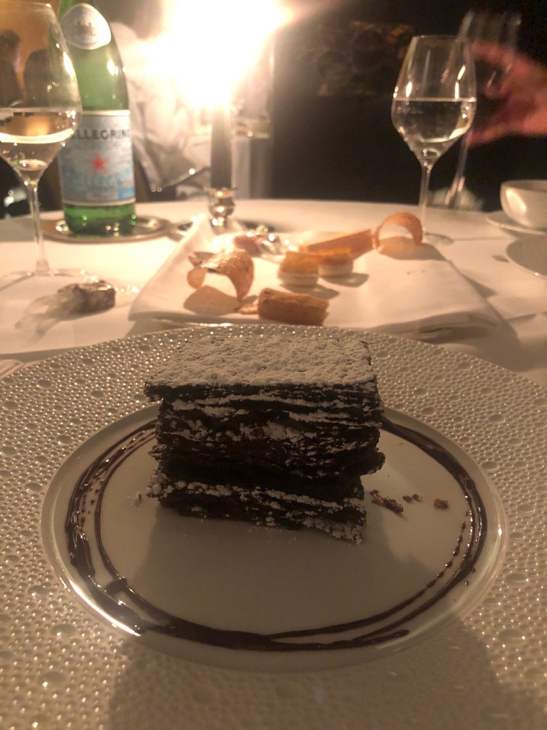 Dessert was the most disappointing part of the meal. I was very excited about the possibility of being served a millefeuille by Chef Passard. Instead of it balancing crunchy and sweet, it only had one texture which was somewhere in the middle of crunchy and soggy. The cream filling in between the layers felt one-note, only allowing the taste of sugar and no other intricacy. The macaron felt the same—lackluster.