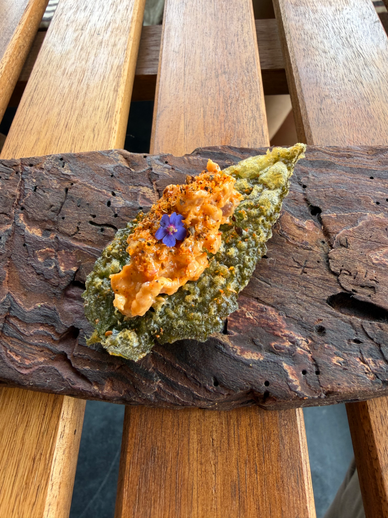 Early on, there was a crisp bichubutti leaf (stinging nettle) paired with a fried mushroom that ate almost like a ssam—textural, slightly electric, grounded in ingredients that felt entirely local. It was one of those bites that makes you pause, not because it’s loud, but because it’s so clearly thought through.