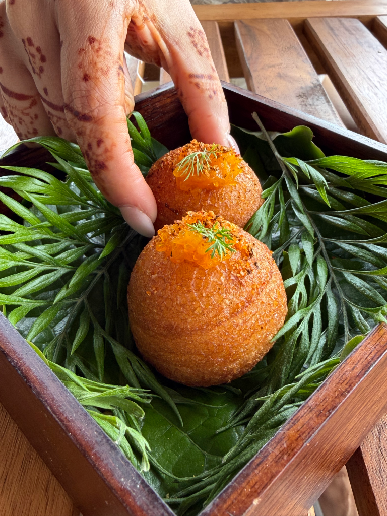 A miniature kachori followed. Coming from a Rajasthani background, it’s a form I know well, but this version felt deliberately reframed—smaller, sharper. Before we ate, the server asked us to guess what the course was. When we hesitated, he shrugged it off with a smile and said they were going to keep feeding us either way. It was a throwaway line, but it captured something important: this wasn’t a tasting menu built on restraint for its own sake. You leave full, in the best way.