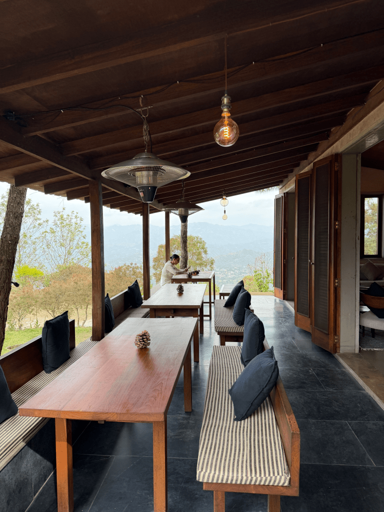 Not long after, we met Dixit Kaundal, the head mixologist, who walked us out to what the team calls the “Naar spot”—a quiet edge overlooking the valley where they do their daily briefings. It’s the kind of view that recalibrates you. We told him we were coming in for a meal and got into an easy conversation about cocktails. He was deeply knowledgeable, clearly exacting, but none of it came with the weight you sometimes feel in more self-serious dining rooms. There was a lightness to him—maybe it was the earring, maybe just the way he carried himself—that stayed with me. It also turned out not to be an anomaly.